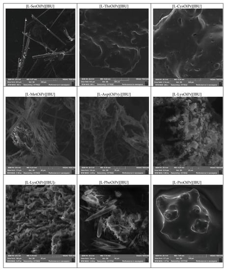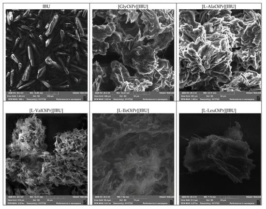 One of the most critical factors affecting solubility and bioavailability is crystal morphology (size and shape of crystals). The SEM of ibuprofen and amino acid isopropyl ester ibuprofenates crystals is given in Figure 7. The shape of unmodified ibuprofen crystals is needle-type crystals. In other cases, the formation of agglomerates is visible—all derivatives of aliphatic amino acids behave similarly and form layer agglomerates. For example, the crystals of L-methionine and L-serine derivatives are needle-shaped like ibuprofen. A layered structure can also be seen for the salt of [L-Asp(OiPr)2][IBU], [L-LysOiPr][IBU], and [L-LysOiPr][IBU]2. In contrast, [L-CysOiPr][IBU] and [L-ProOiPr][IBU] were amorphous. [L-ThrOiPr][IBU] was liquid at the measurement temperature.