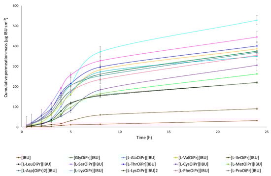 Individual permeation profiles for ibuprofen and amino acid isopropyl ester ibuprofenates are plotted in Figure 8. The content of IBU and its derivatives in the acceptor fluid collected during 24 h permeation is summarised in Table 5. The cumulative ibuprofen mass for individual compounds, determined after 24 h of permeation, was as follows: [L-LysOiPr][IBU] > [L-SerOiPr][IBU] > [L-ThrOiPr][IBU] > [L-Asp(OiPr)2][IBU] > [L-ValOiPr][IBU] > [GlyOiPr][IBU] > [L-ProOiPr][IBU] > [L-PheOiPr][IBU] > [L-AlaOiPr][IBU] > [L-CysOiPr][IBU] > [L-MetOiPr][IBU] > [L-LeuOiPr][IBU] > [L-LysOiPr][IBU]2 > [L-IleOiPr][IBU] and [IBU]. Among the studied derivatives, [L-LysOiPr][IBU] permeated to a higher degree than others; the cumulative amount of substance permeated during the 24 h study was 528.643 ± 22.716 (Table 5, Figure 8). The formation of structural modifications of ibuprofen in the form of charged compounds with lower lipophilicity has an influence on better permeability compared with the more lipophilic ibuprofen. The cluster analysis graph shows the cumulative mass of the IBU and its derivatives measured over the entire 24 h permeation period (Figure S101). In this diagram, three distinct groups characterised by similar permeation can be distinguished (circles A, B, C). Generally, the cumulative mass of all ibuprofen derivatives in the acceptor phase after 24 h of permeation was significantly higher than free ibuprofen (Figure S102). The similarity between derivatives was found using Tukey’s test, which showed a statistically significant difference between all derivatives and pure ibuprofen (p < 0.05) (Table S1 in Supplementary Materials).