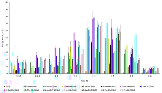 Ibuprofen and amino acid isopropyl ester ibuprofenates permeation profiles. Values are the means with standard deviation; n = 3.