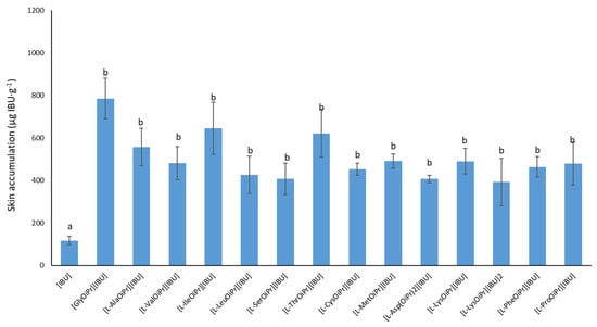 Accumulation in the skin of ibuprofen and amino acid isopropyl ester ibuprofenates during the 24 h penetration; different letters indicate significant differences between the ibuprofenates and control [IBU], p < 0.0001, mean ± SD, n = 3; (mean ± SD, n = 3). The statistically significant difference was estimated by ANOVA using Tukey’s test.