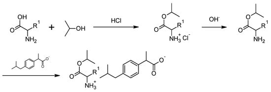 As a result of the three-step reaction, the ibuprofenates of amino acid alkyl esters were obtained in high yields (85–99%). In the last step of the reaction, the amino acid isopropyl ester was combined with ibuprofen without using a solvent. The use of the solvent-free method is associated with the limitation of volatile organic compounds and the costs of the process itself. Furthermore, due to the last reaction step, no reaction by-products are formed, and the product is obtained with high purity.