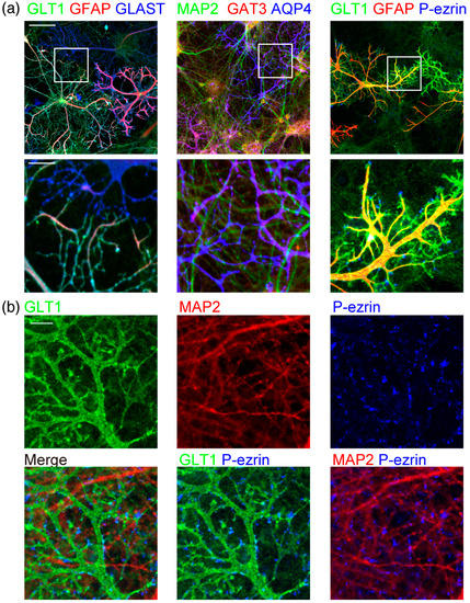 Morphology of astrocytes and neurons in co-culture. (a) Astrocytes and neurons in rat cerebrum neuron–astrocyte co-culture on DIV15, immunostained by neuronal or astrocytic marker antibodies. Left, astrocytic markers of GLT1 (green), GFAP (red), and GLAST (blue). Middle, a neuronal dendritic marker of MAP2 (green) and astrocytic markers of GAT3 (red) and AQP4 (blue). Right, GLT1 (green), GFAP (red), and phospho-ezrin (blue). Top, scale bar, 100 µm. Bottom, an enlarged view of the area indicated with a square in the left image. Scale bar, 25 µm. Similar results were obtained for 3–7 independently prepared cultures. Images of each channel are provided in Figure S1. (b) High-magnification images of astrocytes and neurons in rat cerebrum neuron–astrocyte co-culture on DIV19. Astrocytic marker GLT1 (green), MAP2 (red), and phospho-ezrin (blue). Scale bar, 10 µm. Similar results were obtained for 3 independently prepared cultures.
