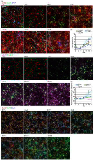 We immunostained the neuron–astrocyte co-culture with transporter proteins. The cellular location and expression of these major astrocytic markers are important for the functional maturation of astrocytes. Astrocytes express two glutamate transporters, GLAST (glutamate aspartate transporter) and GLT1 (glutamate transporter 1), for the clearance of glutamate released to synapses. Both GLAST and GLT1 are localized to the astrocyte plasma membrane, including their branches approaching neurons (Figure 1a). Astrocytic intermediate filament GFAP (glial fibrillary acidic protein) was in most major branches but did not reach their small glutamate transporter positive process tips. GABA (γ-aminobutyric acid) transporter GAT3 (GABA transporter 3) was also localized to astrocyte branches. Astrocytic water channel AQP4 (aquaporin 4) is localized to astrocyte endfeet facing the blood vessels in the brain [15]. AQP4 was uniformly localized to the plasma membrane in this culture without blood vessels.