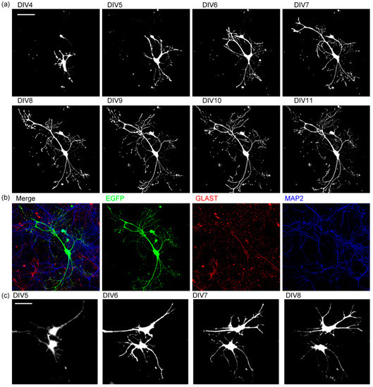 pEGFP-N1 (6085-1, Clontech, now Takara Bio Inc., Shiga, Japan) was introduced to astrocytes using Lipofectamine LTX and PLUS (15338100, Thermo Fisher Scientific, Waltham, MA, USA) on DIV2. For each well of a rat cerebrum neuron–astrocyte co-culture in 96-well plates, 0.15 µg plasmid, 0.15 µL Lipofectamine LTX, and 0.05 µL PLUS in 5 µL Opti-MEM (31985062, Thermo Fisher Scientific, Waltham, MA, USA) were used. Fluorescence signals were observed within 8 h after transfection and lasted for ten days.
