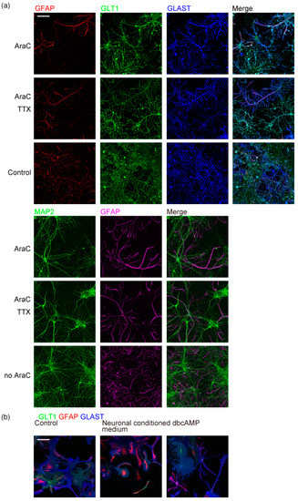 Culture requirements for astrocyte tiling. (a) Neuron and astrocytes in rat cerebrum neuron–astrocyte co-culture immunostained on DIV15. n = 4. Top, cellular proliferation was suppressed by 5 µM AraC. Middle, proliferation was suppressed by 5 µM AraC, and action potential generation was suppressed by 10 µM TTX supplemented every two days. Bottom, without proliferation suppression. Top, GFAP (red), GLT1 (green), and GLAST (blue). Bottom, MAP2 (green), and GFAP (magenta). Scale bar, 100 µm. Similar results were obtained for 3 independently prepared cultures. (b) Astrocytes in rat cerebrum primary glial culture treated with glutamate receptor ligands for 24 h, immunostained on DIV17. GLT1 (green), GFAP (red), and GLAST (blue). Neuronal conditioned medium was obtained from neuron–astrocyte co-culture prepared in parallel. Cells were prepared in parallel with Figure 1a top and imaged under the same conditions with the same linear signal enhancement. Scale bar, 100 µm. Similar results were obtained for 3 independently prepared cultures. Images of each channel are provided in Figure S4.