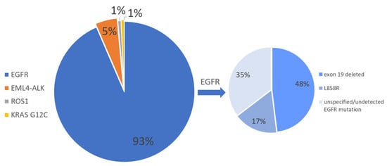 Currently, to treat advanced-stage patients with reimbursed drugs in Europe, four molecular alterations are considered as the minimum requirement in the diagnostic flow of non-small cell lung cancer (NSCLC): epidermal growth factor receptor (EGFR) mutations, anaplastic lymphoma kinase (ALK), ROS proto-oncogene 1 (ROS1) rearrangements, and v-raf murine sarcoma viral oncogene homolog B1 (BRAF) mutations []. Through different drug access strategies—such as clinical trials, expanded access programs, patient name use programs, and non-negotiated conditions—additional driver alterations have been identified as targets for new therapeutic options: mesenchymal to epithelial transition (MET) exon-14 skipping mutations, rearranged during transfection (RET) proto oncogene fusions, neurotrophic tyrosine receptor kinase (NTRK) fusions, and Kirsten rat sarcoma virus (KRAS) G12C mutations [].