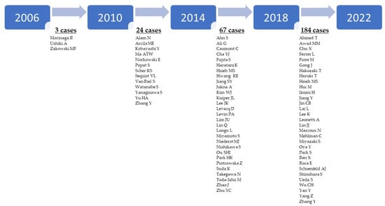 Timeline of switched oncogene-addicted NSCLCs. The timeline shows a significant increase in the number of switched oncogene-addicted NSCLC reported in the literature from 2006 to 2022.