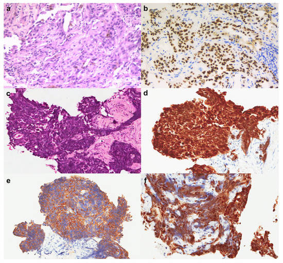 - Toda-Ishii, M.; Akaike, K.; Kurisaki-Arakawa, A.; Arakawa, A.; Mukaihara, K.; Suehara, Y.; Takagi, T.; Kaneko, K.; Yao, T.; Saito, T. Sarcomatous transformation of EGFR and TP53 mutation-positive metastatic adenocarcinoma of the lungs, masquerading as a primary pleomorphic sarcoma of the proximal femur. Int. J. Clin. Exp. Pathol. 2015, 8, 3270–3278. [Google Scholar]