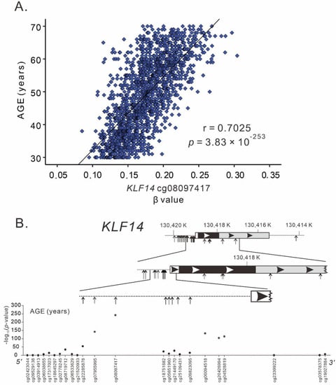 KLF14 methylation and age: (A) Association between KLF14 promoter methylation cg08097417 level and chronologic age and (B) Genomic structure of KLF14 and the association between KLF14 methylation status and age.