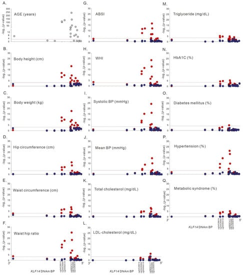 Regional plot association analysis betweenKLF14 methylation status and the studied phenotypes (A) Age, (B) Body height, (C) Body weight, (D) Hip circumference, (E) Waist circumference, (F) Waist hip ratio, (G) ABSI, (H) WHI, (I) Systolic BP, (J) Mean BP, (K) Total cholesterol, (L) LDL-cholesterol, (M) Triglyceride, (N) HbA1c, (O) Diabetes mellitus, (P) Hypertension, (Q) Metabolic syndrome, with (blue circle) or without (red circle) adjustment for age. The results showed subsidence of significant associations after adjustment for age.