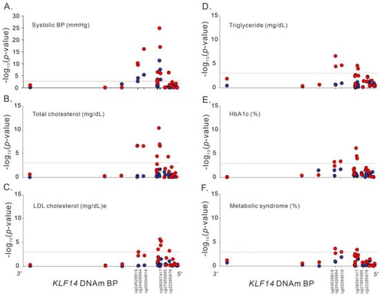 Regional plot association analysis between the studied phenotypes (A) Systolic BP, (B) Total cholesterol, (C) LDL cholesterol, (D) Triglyceride, (E) HbA1c, (F) Metabolic syndrome, and DNA methylation status according to sex, with red circles representing female participants and blue circles representing male participants.