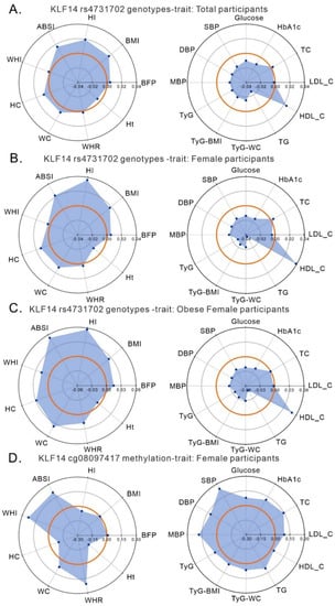 KLF14 rs4731702 genotype (A–C) and KLF14 promoter methylation site cg08097417 (D) and their associations with body shape indices (left panel) and metabolic traits (right panel) in the Taiwan Biobank population. Standardized coefficients (beta) are shown in Radar plots for total participants (A), female participants (B,D), and obese female participants (C). The middle of the three concentric circles is labeled “0,” representing no association between the KLF14 variant and methylation status and trait. Points falling outside the middle octagon or dodecagon represent positive variant–trait or methylation–trait associations, whereas those inside it represent negative variant–trait or methylation–trait associations.