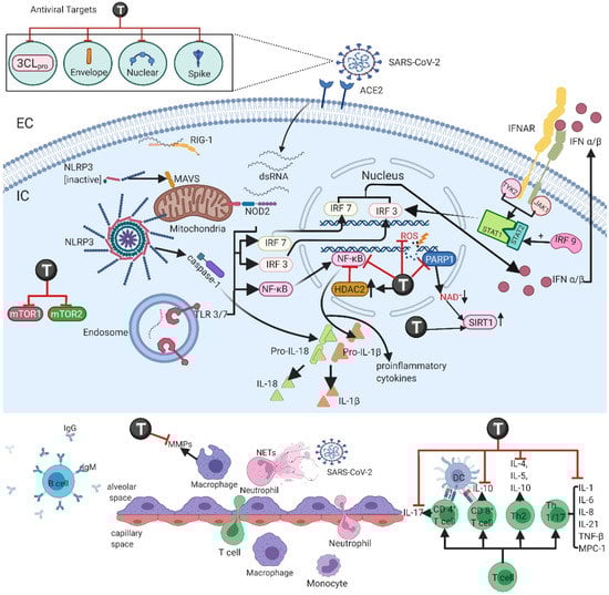 SARS-CoV-2 enters the cell through ACE2 found in the membrane of type II pneumocytes. The immune response is initiated through the activation of PRRS (TLR, NLR, RIG-1) located in the membrane and cytosol interacting with the viral RNA. The stimulation of these receptors leads to the activation of transcription regulating factors such as IRF 3/7 and NF-kB, which leads to the production of interferons type I/III and other pro-inflammatory cytokines. Theophylline modulation of HDAC2 inhibits NF-kB and inflammatory genes. DNA damage produced by ROS production activates PARP1, which leads to NAD+ depletion, decreasing SIRT1 activity. Theophylline inhibits PARP1, decreases ROS production, and enhances SIRT1 expression and activity. mTOR inhibition by theophylline contributes to attenuating the inflammatory response. The production of these cytokines initiates the recruitment of neutrophils and recruitment and differentiation of monocytes into alveolar macrophages. The cytokine storm microenvironment produced as a result of the viral infection stimulates the activation and differentiation of cytotoxic CD8+ and helper CD4+ T cells necessary for viral clearance, initiating the production of cytokines, recruitment of monocytes and neutrophils, promoting the immune response. The proposed antiviral effects of theophylline are highlighted. In order to successfully limit the viral infection in later phases of the disease and to prevent future reinfections, the participation of the humoral response and production of antibodies is needed. Abbreviations: T—theophylline; PRRs—pattern recognition receptors; TLR—Toll-like receptors; RIG-1—gene-I proteins inducible by retinoic acid; NLR—NOD-like receptors; IRF 3/7—interferon regulatory factors; NF-κB—pro-inflammatory nuclear transcription factor; HDAC2—histone deacetylase 2; ROS—reactive oxygen species; PARP1—poly ADP ribose polymerase 1; SIRT1—sirtuin 1; mTOR—mechanistic target of rapamycin pathway; MMPs—matrix metalloproteinases.