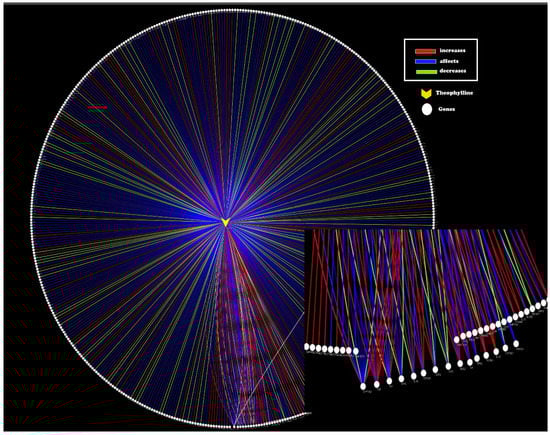 Pharmacological network biology analysis of theophylline-genes interaction. Node in yellow represents theophylline and white nodes represent genes that are modified to different degrees: somehow affected (blue), increased (red) or decreased activity (green) according to the Comparative Toxicogenomics Database [].