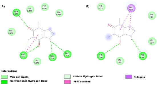 Molecular docking between theophylline and SARS-CoV-2 proteins (spike and protein E). In both couplings, we observe Van der Waals forces. (A) The interactions between theophylline and the spike protein show 4 hydrogen bonds and a Pi–Pi stacked interaction. (B) The relation with the E protein has Pi–sigma interactions and two hydrogen bonds. Molecular docking of protein E with theophylline showed that the delta G was −5.0 kcal/mol. (B) illustrates that the xanthine binds to amino acids Phe23E, Phe26A, Phe26E, Leu27E, Val29A, Val29E, and Thr30E (methodology in Supplementary Materials [,,]).