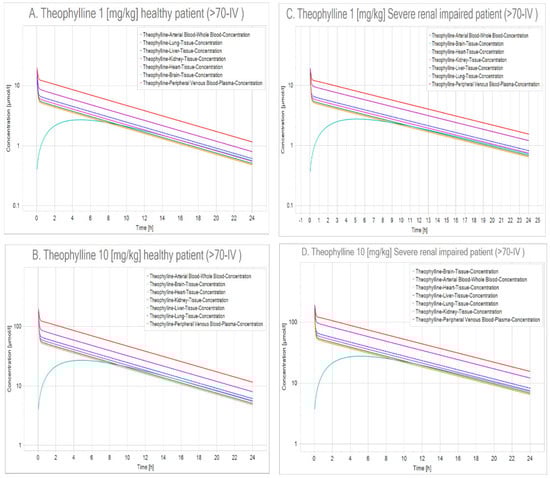Physiologically based pharmacokinetic model (PBPK) simulation of theophylline at two concentrations modeled in a healthy patient and a patient with renal impairment. (A) Healthy patient dosed with 1 mg/kg, (B) Healthy patient that received 10 mg/kg, (C) Renal impaired patient administered 1 mg/kg. (D) Renal impaired patient dosed with 10 mg/kg. When results of the healthy patient were compared with those of the renal insufficiency patient, a slight increase in the time of theophylline body retention was observed in all organs studied (clearance reduction). Tissue concentration curves for the lungs (dotted blue curves) illustrate that the longest time for theophylline removal takes place in this tissue (Supplementary Materials Table S1).