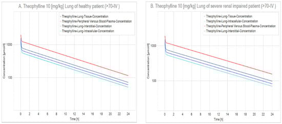 Physiologically based pharmacokinetics model (PBPK) simulation of 10 mg/kg theophylline in the lungs. (A) Kinetics in the lung of a healthy patient. (B) Kinetics in the lung of a patient with renal impairment. This figure shows that theophylline clearance is sensibly delayed in patients with impaired renal function. When comparing both charts, a decrease in the inclination of the lung concentration curves can be observed for the patient with renal failure. Noteworthy, renal elimination is the main route to excrete theophylline and consequently, a reduced clearance increases the time the drug remains in the body increasing the possibility of unwanted side effects (Supplementary Materials Table S2).