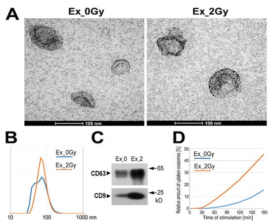 Characteristics of exosomes: TEM imaging of vesicles (A); size of vesicles assessed by DLS measurement (B); and the presence of exosome markers (C) in total sEVs released by mock-irradiated FaDu cells (Ex_0Gy) and cells irradiated with 2 Gy dose (Ex_2Gy); (D) relative amounts of internalized vesicles based on the accumulation of exosome membrane-bound dyes (expressed as a percentage of a dye level noted after 6 h of co-incubation).