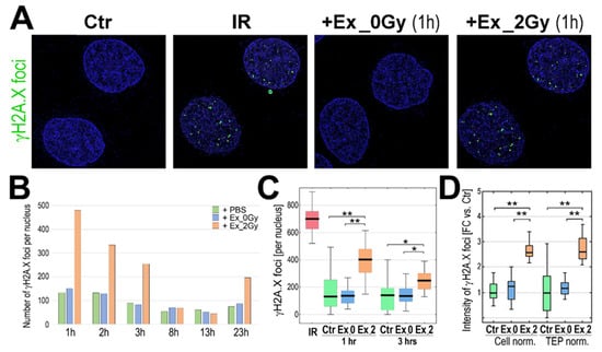 To address a hypothetical RIBE activated in exosome-stimulated cells, we analyzed the presence of the so-called γH2A.X foci in nuclei of recipient cells, a generally accepted marker of DNA strand breaks which, in the case of radiation-induced DNA double-stranded breaks, showed dose dependence []. We found that the levels of γH2A.X foci in the nuclei of cells directly irradiated with a 2 Gy dose (1 h after irradiation) and nuclei of Ex_2Gy-stimulated cells (after 1 h of incubation) were comparably high. In marked contrast, generally low levels of γH2A.X foci in nuclei of Ex_0Gy-stimulated cells were similar to that in the naive untreated control cells (Figure 2A), which indicated that exosomes released by irradiated cells induced RIBE in the naive, non-irradiated cells. The highest level of Ex_2Gy-induced γH2A.X foci was noted after 1 h of co-incubation; then, it gradually decreased, and the levels of γH2A.X foci in cells stimulated with Ex_2Gy were similar to the background level in control cells after 6–8 h of co-incubation. However, another wave of γH2A.X foci was noted after 23 h of stimulation with Ex_2Gy; the latter effect was weaker (Figure 2B), and we further focused on the early effect. The number of γH2A.X foci was significantly higher in cells stimulated with Ex_2Gy than in control naive cells or cells stimulated with Ex_0Gy, both after 1 and 3 h of stimulation (p > 0.001 and p > 0.05, respectively; Figure 2C). Furthermore, a similar difference between exosomes released by irradiated and mock-irradiated cells was observed when the amounts of Ex_2Gy and Ex_0Gy were standardized according to the actual TEP (Figure 2D), which indicated that the specific effect of exosomes released by irradiated cells was associated with their “quality”, not quantity.