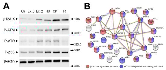 Exosome-stimulated changes in the phosphoproteome of the recipient cells. (A) Phosphorylation of selected DNA damage-related proteins analyzed by Western blotting. FaDu cells were stimulated with exosomes released by sham-irradiated (Ex_0Gy) or irradiated (Ex_2Gy) cells, hydroxyurea (HU), and camptothecin (CPT) or directly irradiated with 2 Gy (IR); β-actin was used as a loading control (raw Western blot images are available in Figure S1). (B) Network of putative interactions between proteins phosphorylation which was induced in FaDu cells after one hour of stimulation with Ex_2Gy vesicles; color-coded are the proteins associated with two selected GO terms: nuclear localization and nucleic acid binding function (p-value refers to the significance of the term overrepresentation).