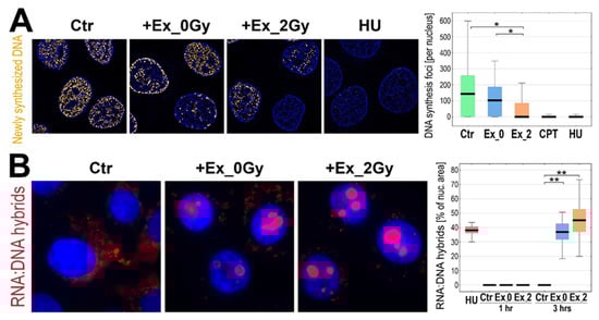 Inhibition of DNA replication by exosomes from irradiated cells. (A) Foci of newly replicated DNA initiated in FaDu cells after one-hour of incubation with exosomes released by sham-irradiated (Ex_0Gy) or irradiated (Ex_2Gy) cells or with HU or CPT. (B) Visualization of RNA:DNA hybrids in nuclei of FaDu cells incubated for 3 h with Ex_0Gy or Ex_2Gy vesicles; the graph shows the relative occupancy of RNA:DNA hybrids in the nuclei cells incubated with exosomes (1 or 3 h) or HU (1 h). Box plots show the median, minimum, maximum, and lower and upper quartiles; statistically significant differences between groups are represented by asterisks: * p < 0.05 and ** p < 0.001 (only differences between Ctr and exosome-stimulated cells are shown for clarity).