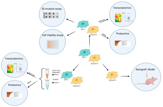 Overall study design. GSC lines D10-0171 and D317 were utilized to test the ability of GZ17-6.02 to inhibit the growth of EGFRvIII+ glioblastoma. The molecular differences between these cell lines were determined with Matrigel invasion and cell viability assays, transcriptomic analysis, and proteomic analysis. These cell lines were also used to characterize the gene and protein expression changes that occur as a result of GZ17-6.02 treatment. The more invasive D10-0171 alone was utilized in a subcutaneous xenograft model. RPPA, reverse phase protein analysis. This figure was created with biorender.com (accessed on 2 February 2022).