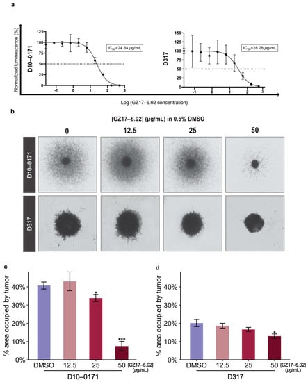 The overall study design is shown in Figure 1. Results from CellTiter-Glo viability assays are shown in Figure 2a. As can be seen, GZ17-6.02 inhibits the growth of both D10-0171 and D317 GSCs with comparable IC50 values: 24.84 µg/mL for D10-0171 and 28.28 µg/mL for D317. We next evaluated the ability of GZ17-6.02 to suppress the invasive behavior of D10-0171 and D317 using a Matrigel invasion assay. As Figure 2b shows, the invasion of both D10-0171 and D317 is inhibited by GZ17-6.02. ImageJ was used to quantify the data obtained from the invasion assay. This analysis demonstrated a significant decrease in area occupied by tumor spheroids and their radial projections following GZ17-6.02 treatment in both cell lines. For D10-0171, a GZ17-6.02 concentration of 25 µg/mL resulted in a decrease in area occupied by tumor from (mean ± standard deviation) 40.75 ± 1.92% for control cells to 33.83 ± 1.94% for treated cells (p = 0.023), while a GZ17-6.02 concentration of 50 µg/mL resulted in a decrease in area occupied by tumor to 7.49 ± 2.63% (p < 0.001) (Figure 2c). For D317, a GZ17-6.02 concentration of 50 µg/mL resulted in a decrease in area occupied by tumor from 20.12 ± 1.98% for control cells to 12.94 ± 1.24% in treated cells (p = 0.012) (Figure 2d). This assay indicates that while GZ17-6.02 inhibits the growth and invasion of both D10-0171 and D317, its effect on D10-0171 is much more pronounced.