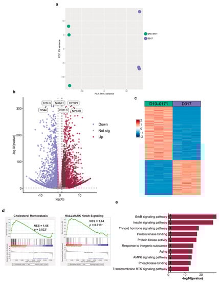 To identify the pathways that are upregulated in D10-0171 compared to D317, we also analyzed the transcriptomic data using gene set enrichment analysis (GSEA) with the hallmark gene set collection as reference. This analysis revealed upregulation of 2 pathways in D10-0171 compared to D317: cholesterol homeostasis and notch signaling (Figure 3d), both of which have been implicated in glioblastoma growth and progression [,,,].