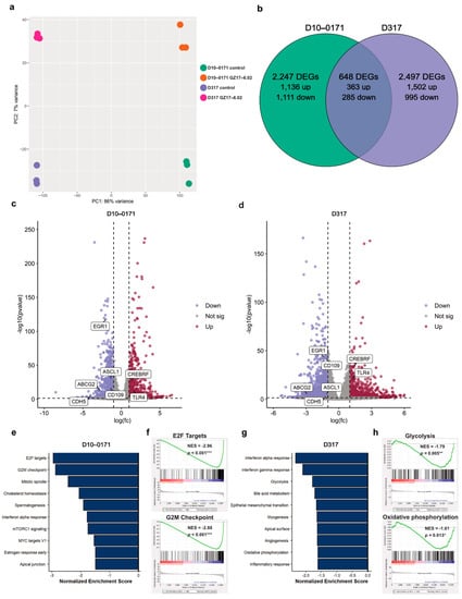 D10-0171 cells were treated with vehicle or GZ17-6.02 for 24 h. Total RNA was isolated using RNeasy plus kit (Qiagen #74034; Hilden, Germany). RNA-seq data was obtained at the Duke University Center for Genomic and Computational Biology and processed using the TrimGalore toolkit (https://www.bioinformatics.babraham.ac.uk/projects/trim_galore (accessed on 4 January 2020)). Only reads 20 nt or longer after trimming were kept for further analysis. Reads were mapped to the GRCh38v93 version of the human genome and transcriptome [] using the STAR RNA-seq alignment tool []. Reads were kept for subsequent analysis if they mapped to a single genomic location. Gene counts were compiled using the HTSeq tool. Only genes that had at least 10 reads in any given library were used in subsequent analysis. Normalization and differential expression were carried out using the DESeq2 [] Bioconductor [] package with the R statistical programming environment version 4.1.2. The false discovery rate was calculated to control for multiple hypothesis testing. Gene set enrichment analysis was performed to identify gene ontology terms and pathways associated with altered gene expression for each of the comparisons performed. Gene set variation analysis was conducted with the GSVA R Bioconductor package using the R statistical programming environment version 4.1.2 []. Differentially expressed genes were defined as coding genes with a log fold change greater than 1 or less than −1 and a false discovery rate-adjusted p-value less than 0.05.
