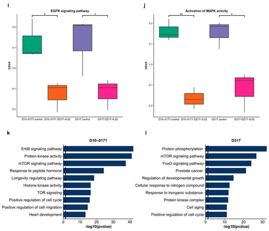 Data from GSEAs showed a differential effect of GZ17-6.02 on D10-0171 and D317. However, when we analyzed GZ17-6.02’s effect on EGFR signaling using gene set variation analysis (GSVA), we found that GZ17-6.02 significantly downregulated EGFR signaling (Figure 4i) and activation of mitogen-activated protein kinase (MAPK) activity (Figure 4j) in both cell lines.