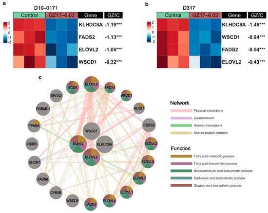 GZ17-6.02 downregulates key GSC super-enhancer genes. (a) Heatmap of mRNA expression of GSC super-enhancer genes in control and GZ17-6.02 treated D10-0171 GSCs. (b) Heatmap of mRNA expression of GSC super-enhancer genes in control and GZ17-6.02 treated D317 GSCs. The p-values shown are false discovery rate-adjusted p-values. (c) GeneMANIA functional association gene network for GSC super-enhancer genes. Physical interactions and genetic interactions are shown as pink and green lines, respectively, while co-expression is shown as purple lines, and shared protein domains are shown as yellow lines. Stronger associations are shown with thicker lines. Genes are colored based on the top 5 over-represented shared function. Genes colored yellow share functions related to the fatty acid metabolic process, genes colored purple share functions related to the fatty acid biosynthetic process, genes colored green share functions related to the monocarboxylic acid biosynthetic process, genes colored blue share functions related to the carboxylic acid biosynthetic process, and genes colored red share functions related to the organic acid biosynthetic process. Fold change shown is log base 2-fold change. *** p < 0.001. GZ, GZ17-6.02; C, control.