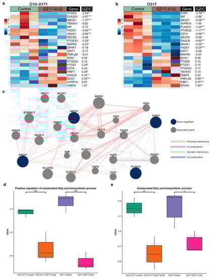 GZ17-6.02 downregulates unsaturated fatty acid biosynthesis. (a) Heatmap of mRNA expression of select unsaturated fatty acid biosynthesis related genes in control and GZ17-6.02 treated D10-0171 GSCs. (b) Heatmap of mRNA expression of select unsaturated fatty acid biosynthesis related genes in control and GZ17-6.02 treated D317 GSCs. The p-values shown are false discovery rate-adjusted p-values. (c) GeneMANIA functional association gene network for select unsaturated fatty acid biosynthesis related genes. Genes shown in blue are downregulated by GZ17-6.02 in both D10-0171 and D317, while associated genes are shown in gray. Physical and genetic interactions are shown in pink and green, respectively, while co-expression and co-localization between genes are shown in purple and blue, respectively. Thicker lines indicate stronger associations. (d) GSVA comparison of positive regulation of unsaturated fatty acid biosynthetic process in control and GZ17-6.02 treated D10-0171 and D317 GSCs showing a significant decrease in both following GZ17-6.02 treatment. (e) GSVA comparison of unsaturated fatty acid biosynthetic process in control and GZ17-6.02 treated D10-0171 and D317 GSCs showing a significant decrease in both following GZ17-6.02 treatment. Fold changes shown are log base 2-fold changes. * p < 0.05, ** p < 0.01, *** p < 0.001. GZ, GZ17-6.02; GSVA, gene set variation analysis; C, control.