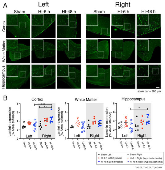 Immunohistochemical images and quantification of microvessels in the cerebral cortex, white matter, and hippocampus on the left hypoxic and right HI sides in the brain of the neonatal rats in the Sham, HI-6 h, and HI-48 h groups. (A) Representative images of microvessels (laminin, Green) in the cerebral cortex, white matter, and hippocampus in neonatal rats. Magnification, 10×. Each inset contains high magnification images. Scale bar = 200 μm. (B) Quantification of microvessel density shown by laminin expression (% Area Stained) in the cerebral cortex, white matter, and hippocampus of left hypoxic and right HI sides of rat brain in Sham (left; black open circles, right; black closed circles), HI-6 h (left; red open circles, right; red closed circles), and HI-48 h (left; red open circles, right; red closed circles). Values’ median and dot plots. * p < 0.05, ** p < 0.01, *** p < 0.001.