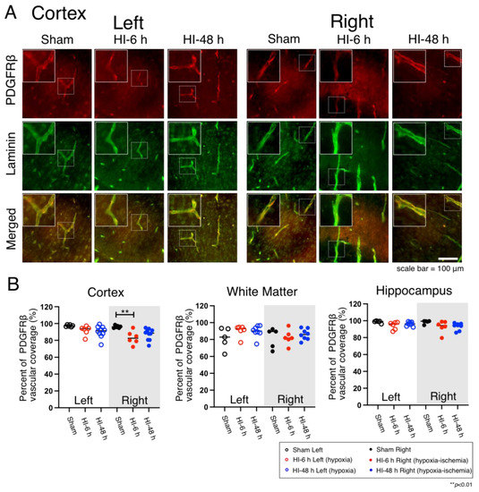 Immunohistochemical expression and quantification of pericyte coverage in the cerebral cortex, white matter, and hippocampus on the left hypoxic and right HI sides in the brain of the neonatal rats in the Sham, HI-6 h, and HI-48 h groups. (A) Representative images of pericyte (PDGFRβ, Red), microvessels (Laminin, Green), and merged double immunostaining in the cerebral cortex of the neonatal rats. Magnification, 40×. Each inset contains high magnification images. Scale bar = 100 μm. The immunohistochemical images in white matter and hippocampus are shown in Supplemental Figure S1. (B) Quantification of pericyte coverage shown by percent of PDGFRβ vascular coverage in the cerebral cortex, white matter, and hippocampus of left hypoxic and right HI sides of rat brain in Sham (left; black open circles, right; black closed circles), HI-6 h (left; red open circle, right; red closed circles), and HI-48 h (left; red open circles, right; red closed circles). Values median and dot plots. ** p < 0.01.