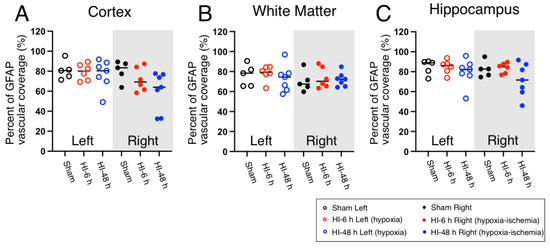 Quantification of astrocyte coverage in the cerebral cortex (A), white matter (B), and hippocampus (C) on the left hypoxic and right HI sides in the brain of the neonatal rats in the Sham, HI-6 h, and HI-48 h groups. Quantification of astrocyte coverage shown by percent of GFAP vascular coverage in the cerebral cortex (A), white matter (B), and hippocampus (C) of left hypoxic and right HI sides of rat brain in Sham (left; black open circles, right; black closed circles), HI-6 h (left; red open circles, right; red closed circles), and HI-48 h (left; red open circles, right; red closed circles). Values median and dot plots. The quantification was based upon immunohistochemical images found in Supplementary Figure S2.