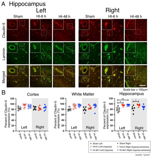 Immunohistochemical expression and quantification of vascular claudin-5 expression in the cerebral cortex, white matter, and hippocampus on the left hypoxic and right HI sides in the brain of the neonatal rats in the Sham, HI-6 h, and HI-48 h groups. (A) Representative images of claudin-5 (Claudin-5, Red), microvessels (Laminin, Green), and merged double immunostaining in the cerebral cortex of left hypoxic and right HI sides of rat brain in Sham, HI-6 h, and HI-48 h groups. Magnification, 40×. Each inset contains high magnification images. Scale bar = 100 μm. The immunohistochemical images in the cerebral cortex and hippocampus are shown in Supplementary Figure S3. (B) Quantification of vascular claudin-5 expression shown by percent of vascular claudin-5 expression in the cerebral cortex, white matter, and hippocampus of the hypoxic left and HI right sides of rat brain in Sham (left; black open circles, right; black closed circles), HI-6 h (left; red open circles, right; red closed circles), and HI-48 h (left; red open circles, right; red closed circles) groups. Values median and dot plots. * p < 0.05, ** p < 0.01.