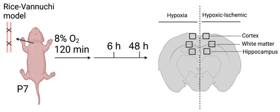 The neonatal rats were born in time-mated dams (Charles River Laboratories, Shrewsbury, MA, USA) in the Animal Care Facility of Brown University. Pregnant Wistar dams were transported on embryonic day 15 (E15) or E16 and housed in a 12 h light/dark cycled facility with ad libitum access to food and water. The date upon which the rat pups were delivered was designated as postnatal day zero (P0). The pups from different litters born on the same day were culled and balanced so that each dam had no more than 10 pups. The pups were randomly assigned to the sham-operated control and HI-exposed groups on day 7 (P7). HI was induced by right carotid artery ligation along with exposure to 8% oxygen for 2 h according to the previously described methods [50,51].