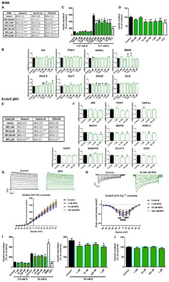 - Marroqui, L.; Martinez-Pinna, J.; Castellano-Munoz, M.; Dos Santos, R.S.; Medina-Gali, R.M.; Soriano, S.; Quesada, I.; Gustafsson, J.A.; Encinar, J.A.; Nadal, A. Bisphenol-S and Bisphenol-F alter mouse pancreatic beta-cell ion channel expression and activity and insulin release through an estrogen receptor ERbeta mediated pathway. Chemosphere 2021, 265, 129051. [Google Scholar] [CrossRef] [PubMed]