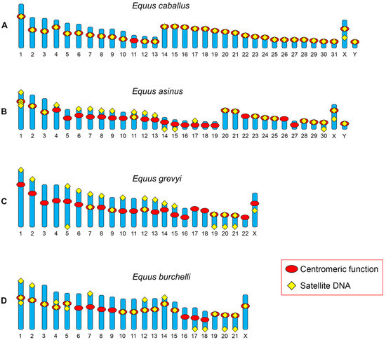 Schematic representation of the chromosomal distribution of satellite DNA obtained by FISH experiments in E. caballus, E. asinus, E. grevyi and E. burchelli. (A) In E. caballus, all centromeres, with the exception of that of chromosome 11, are associated with satellite DNA sequences. Satellite DNA is also present at an interstitial position on the long arm of chromosome X. (B) In E. asinus, 18 centromeres are not associated with satellite DNA sequences at the FISH resolution level. Satellite DNA sequences are present at 13 non-centromeric chromosome ends. Satellite DNA is present at an interstitial position on the long arm of chromosome X. (C) In E. grevyi, 17 centromeres are void of satellite DNA and satellite DNA sequences are present at 15 non-centromeric termini and at an interstitial position of the long arm of the X chromosome. (D) In E. burchelli, 7 centromeres do not display satellite DNA sequences and 9 non-centromeric chromosome ends are associated with satellite DNA. Satellite DNA loci are present in the pericentromeric region of chromosomes 1, 4 and 5. Modified from [14].
