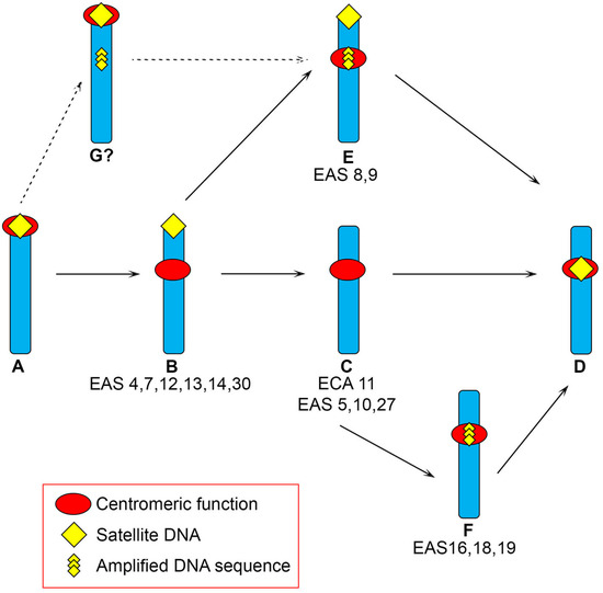 The numerous speciation events that occurred during Equus’ evolution were accompanied by extensive karyotype reshaping due to both chromosome rearrangements and centromere repositioning [14,88,95,96,97]. These phenomena were responsible for a reduction in chromosome number and for the passage from an ancestral karyotype, with the majority of chromosomes being acrocentric, to karyotypes mainly composed by meta- and submeta-centric chromosomes. Several of these (sub)metacentrics harbour a repositioned centromere and, in the majority of them, this centromere is satellite-free [14,96]. The chromosomal distribution of satellite tandem repeats, analysed by FISH in Equus caballus, E. asinus, E. grevyi and E. burchelli [14], revealed that several centromeres are devoid of satellite DNA (Figure 1) and that blocks of satellite DNA sequences are present at several non-centromeric chromosome end (Figure 1B–D). The presence of these large satellite DNA arrays at non-centromeric terminal positions on a subset of (sub)metacentrics with a repositioned satellite-less centromere, combined with the knowledge that ancestral chromosomes were known to be acrocentric, strongly suggests that they are relics of ancestral centromeres.