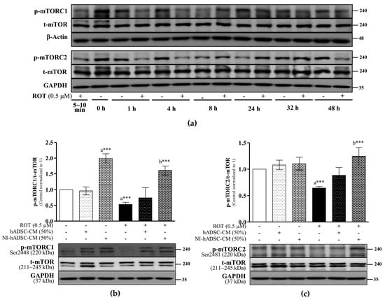 2.2. Effects of NI-hADSC-CM on mTORC1, mTORC2, and DEPTOR Protein Expression in ROT-Exposed SH-SY5Y Cells