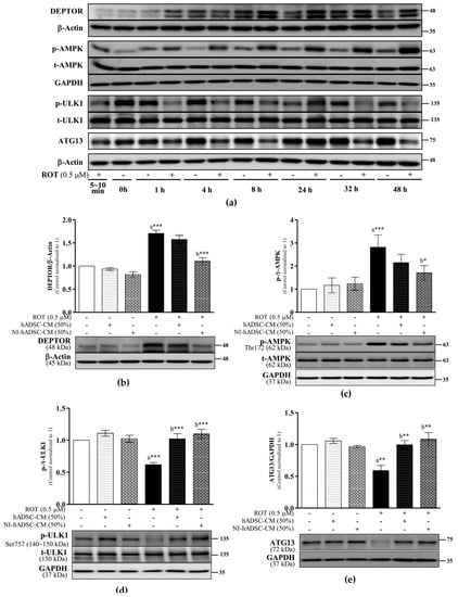 2.3. Effects of NI-hADSC-CM on AMPK, ULK1, and ATG13 Protein Expression in ROT-Exposed SH-SY5Y Cells