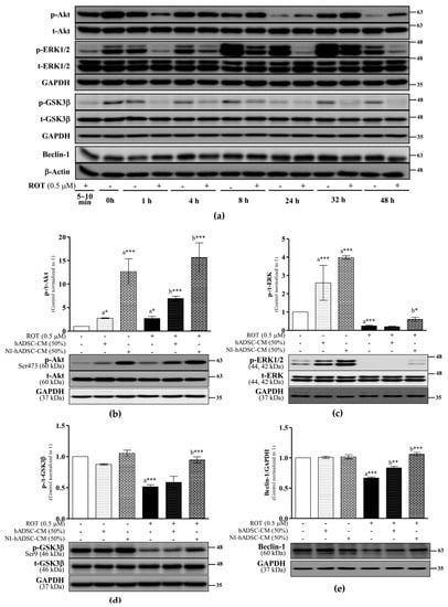 2.4. Effects of NI-hADSC-CM on Akt, ERK, GSK3β, and Beclin-1 Protein Expression in ROT-Exposed SH-SY5Y Cells