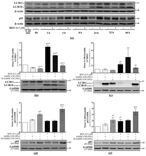 2.5. Effects of NI-hADSC-CM on LC3B and p62 Protein Expression in ROT-Exposed SH-SY5Y Cells