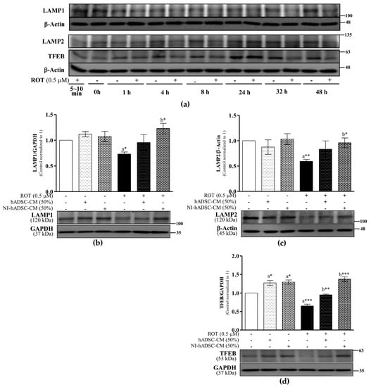 2.7. Effects of NI-hADSC-CM on Lysosomal Protein Expression in ROT-Exposed SH-SY5Y Cells