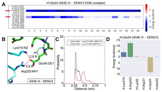 MD simulation of A54E.H with DENV2 EDIII. (A) Energy decomposition analysis: heat map shows energy contribution of residues that interact with Glu54.H per frame in the A54E.H-DENV2 EDIII complex. Twenty frames with a 2.5-ns interval were extracted for the last 50-ns of the MD simulation. Red arrows highlight residues strongly interacting with Glu54.H. (B) New salt bridges were formed between (1) OE1 of Glu54.H and NH1 of Arg323 and (2) OE1 of Glu54.H and NZ of Lys310 in the A54E.H-DENV2 EDIII complex. The interacting atoms are connected by red dashed lines with distances labeled in a representative snapshot. (C) Histograms of atom pair distances in the last 50-ns trajectory. Black represents the distance between OE1 of Glu54 and NH1 of Arg323, and red represents the distance between OE1 of Glu54 and NZ of Lys310. (D) Energy contribution of residues that interacted with Glu54.H, corresponding to the heatmap in (A). The bars represent averages and solid lines represent the standard deviation. The EDIII, 1A1D-2 heavy chain, and light chain are designated as A, H, and L chain, respectively.