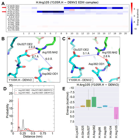 MD simulation of Y105R.H with DENV2 EDIII. (A) Energy decomposition analysis: heat map shows energy contribution of residues that interact with Arg105.H per frame in the Y105R.H-DENV2 EDIII complex. Twenty frames with a 2.5-ns interval were extracted for the last 50-ns of the MD simulation. Red arrows highlight residues strongly interacting with Arg105.H. In the Y105R.H-DENV2 EDIII complex, (B) new salt bridges were formed between NH2 of Arg105.H and OE2 of Glu327, (C) new salt bridges were formed between NH2 of Arg105.H and OD1 of Asp362. Atom pairs are connected by dashed lines in red (interacting) and blue (non-interacting) with distances labeled in representative snapshots. (D) Histograms of atom pair distances in the last 50-ns trajectory. Black represents the distance between NH2 of Arg105 and OE2 of Glu327, and red represents the distance between NH2 of Arg105 and OD1 of Asp362. (E) Energy contribution of residues that interacted with Arg105.H, corresponding to the heatmap in (A). The bars represent averages and solid lines represent the standard deviation. The EDIII, 1A1D-2 heavy chain, and light chain are designated as A, H, and L chain, respectively.