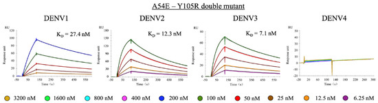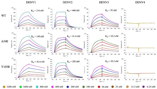 The affinity of WT 1A1D-2 toward EDIII of DENV1 and DENV3 are 216 and 91 nM, respectively (Figure 4, Table 1). For DENV1, A54E and Y105R improved affinities by 1.5- and 5.1-fold compared to WT, respectively. For DENV3, A54E.H, and Y105R.H improved affinities by 8.8- and 1.8-fold, respectively. The trends of affinity improvement by A54.H and Y105R.H were similar toward DENV2 and DENV3. Previous study has shown that 1A1D-2 is unable to neutralize DENV4. Consistently, our result showed that WT did not bind the recombinant DENV4 EDIII. In addition, neither Y105R.H or A54E.H bound DENV4 EDIII in our SPR experiments.