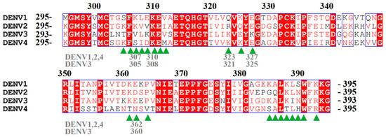 Sequence alignment of DENV1-4 EDIII. DENV3 E protein is two amino acids shorter than other DENV serotypes. Numbering of residues above the sequence is based on DENV1, 2, and 4. The numbers in grey below the sequence highlight key residues mentioned in the main text. The sequence is from DENV1 GuianaFGA891989, DENV2 Thailand/16681/84, DENV3 Philippines/H87/1956, DENV4 Myanmar1976. Epitope residues of 1A1D-2 are indicated using green arrows.