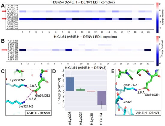 MD simulation of A54E.H with DENV3 and DENV1 EDIII. Energy decomposition analysis: heat maps show energy contribution of residues that interact with Glu54.H per frame in the (A) A54E.H-DENV3 EDIII complex and (B) A54E.H-DENV1 EDIII complex. Twenty frames with a 2.5-ns interval were extracted for the last 50-ns of the MD simulation. Red arrows highlight residues strongly interacting with Glu54.H. (C) In the A54E.H-DENV3 EDIII complex, a stable salt bridge between OE2 of Glu54.H and NZ of Lys308 is highlighted by a red dashed line with the distance labeled in one snapshot. In the same structure, OE2 of Glu54.H and NZ of Lys321 are connected by a purple dashed line with the distance labeled. (D) Energy contribution of residues that interacted with Glu54.H, corresponding to the heatmap in (A). The bars represent averages and solid lines represent the standard deviation. The EDIII, 1A1D-2 heavy chain and light chain are designated as A, H and L chain, respectively. (E) A salt bridge was formed between OE1 of Glu54.H and NZ of Lys310 in the A54E.H-DENV1 complex, highlighted with a red dashed line with the distance labeled.